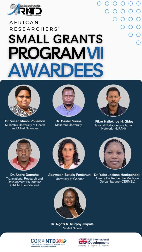 Through the Small Grants Program, ARNTD, with funding from UK International Development and supported by COR-NTD, continues to nurture the next generation of African scientists by providing early- and mid-career researchers with the resources, mentorship, and platform needed to generate locally relevant solutions to neglected tropical diseases. For a 10-month period, the selected awardees will implement innovative projects addressing priority NTD challenges, strengthening research capacity, and contributing to evidence-based interventions across the continent.